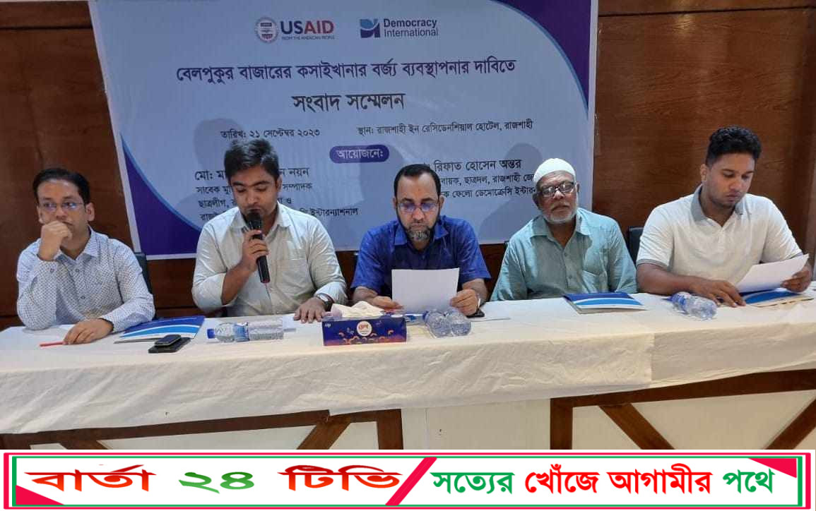 রাজশাহী জেলার অর্ন্তগত বেলপুকুর বাজারে কসাইখানার বর্জের সঠিক ব্যবস্থাপনার দাবিতে রাজশাহী জেলা ছাত্রলীগের সাবেক মুক্তিযুদ্ধ গবেষনা সম্পাদক ও ডেমোক্রেসি ইন্টারন্যাশনাল ২৩তম রাজনৈতিক ফেলো মো: মাজিদুর রহমান নয়ন এবং রাজশাহী জেলা ছাত্রদলের যুগ্ম আহবায়ক ও ডেমোক্রেসি ইন্টারন্যাশনাল ২৩তম রাজনৈতিক ফেলো মো: রিফাত হোসেন অন্তর সম্মিলিতভাবে আজ ২১ সেপ্টেম্বর ২০২৩ইং রোজ রবিবার রাজশাহী ইন রেসিডেনসিয়াল হোটেলে এক সংবাদ সম্মেলনের আয়োজন করেন।