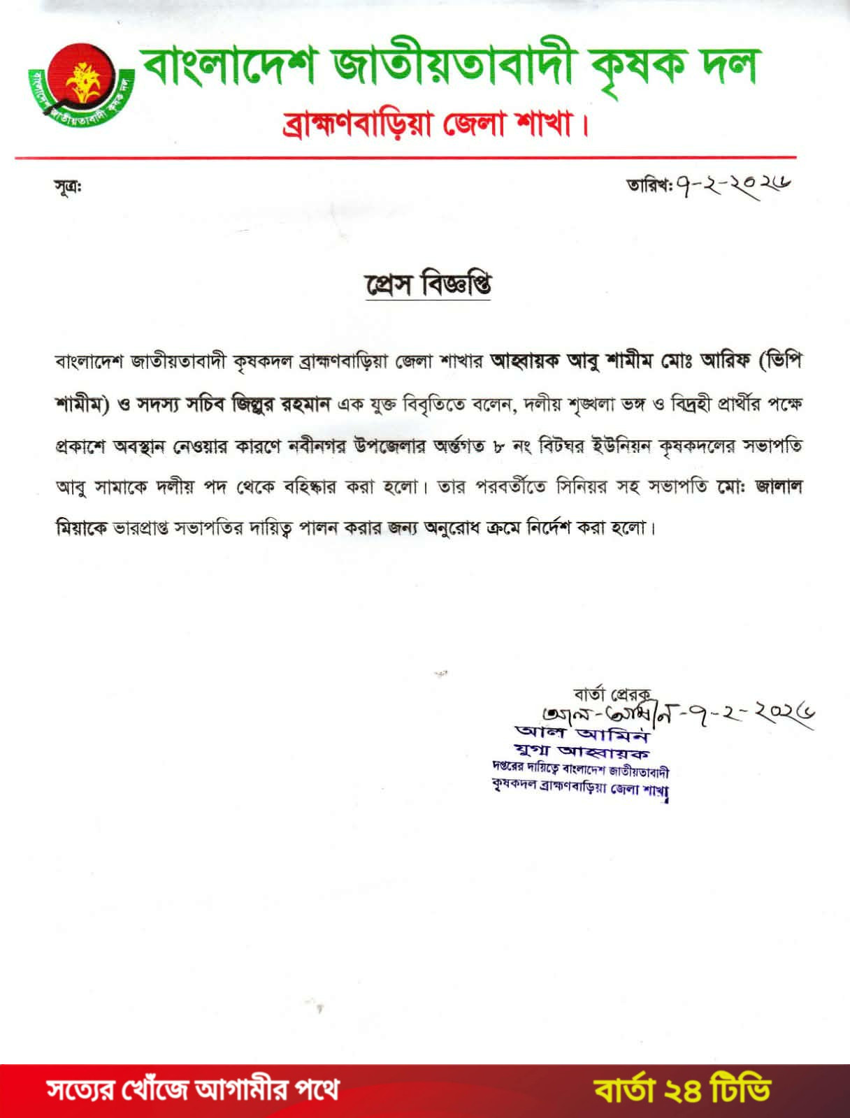 ব্রাহ্মণবাড়িয়ার বিটঘর ইউনিয়নের কৃষক দলের সভাপতি কে বহিষ্কার - Barta24TV.com