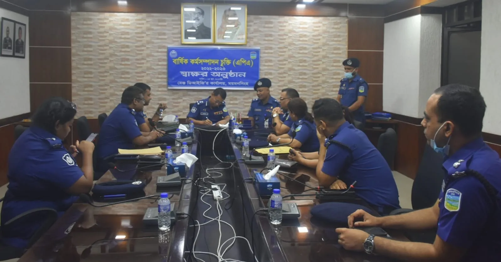গত ০৫ জুন ২০২২ খ্রিষ্টাব্দ ময়মনসিংহ রেঞ্জ ডিআইজি’র কার্যালয় সম্মেলন কক্ষে ময়মনসিংহ রেঞ্জ ডিআইজি মহোদয় ও রেঞ্জাধীন জেলাসমূহের পুলিশ সুপার এবং ইন-সার্ভিস ট্রেনিং সেন্টারের কমান্ড্যান্ট (পুলিশ সুপার)গণদের মধ্যে ২০২২-২০২৩ অর্থবছরের বার্ষিক কর্মসম্পাদন চুক্তি (APA) স্বাক্ষরিত হয়।