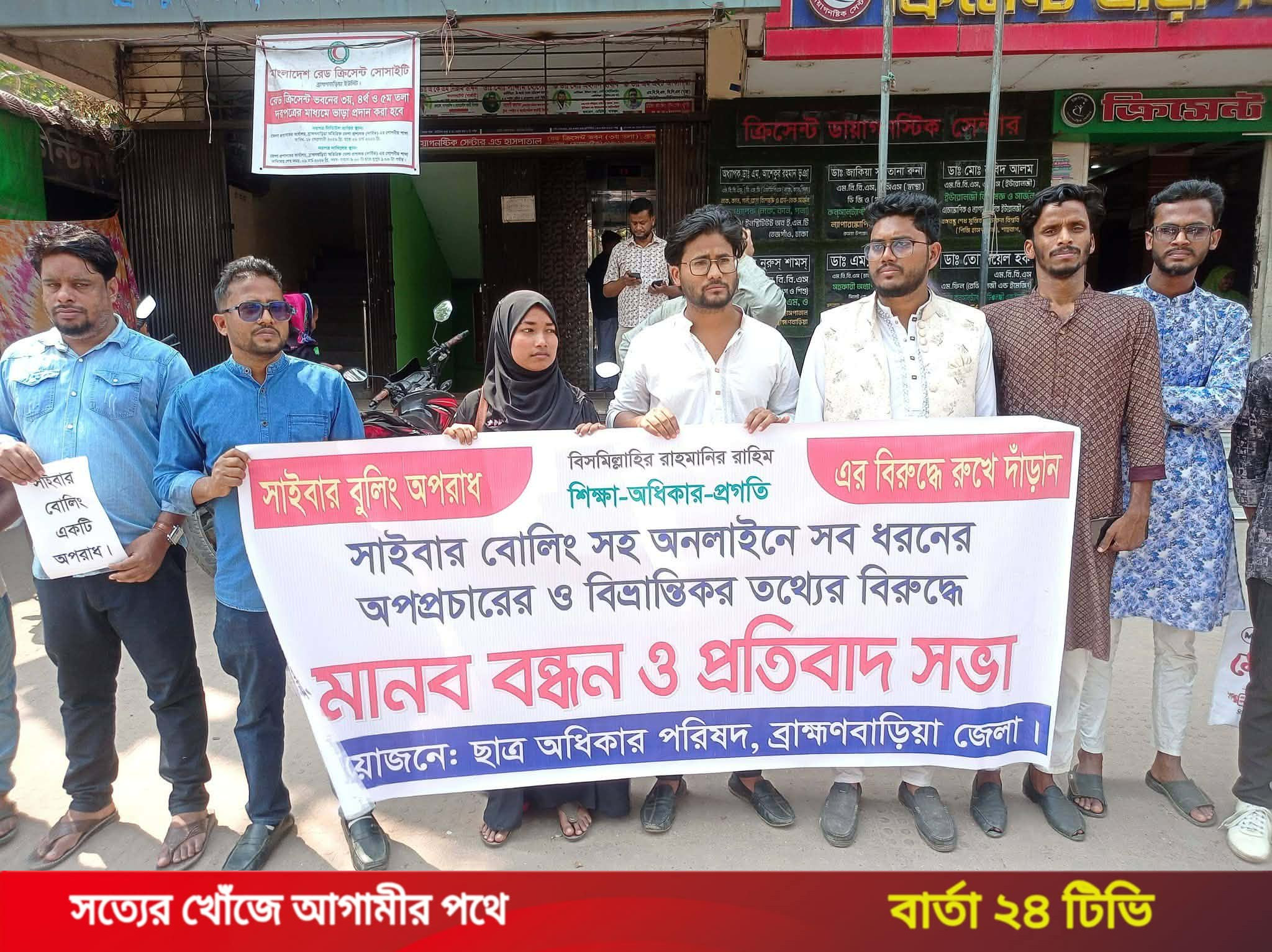 “সাইবার বুলিং অপরাধের বিরুদ্ধে রুখে দাঁড়ান”—এই শ্লোগানকে সামনে রেখে ব্রাহ্মণবাড়িয়ায় সাইবার বুলিংসহ অনলাইনে সব ধরনের অপপ্রচার ও বিভ্রান্তিকর তথ্যের বিরুদ্ধে মানববন্ধন ও প্রতিবাদ সভা অনুষ্ঠিত হয়েছে।